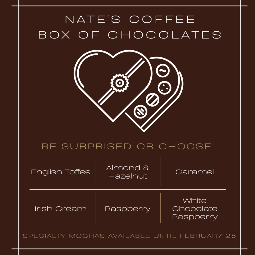 Inspired by the traditional Valentine’s gift of a box of chocolates, this month you can enjoy the same flavor adventure with every drink. Ask for a Box of Chocolates beverage and receive one of six different flavored mochas: English Toffee, Irish Cream, Almond & Hazelnut, Caramel, Raspberry or White Chocolate Raspberry!