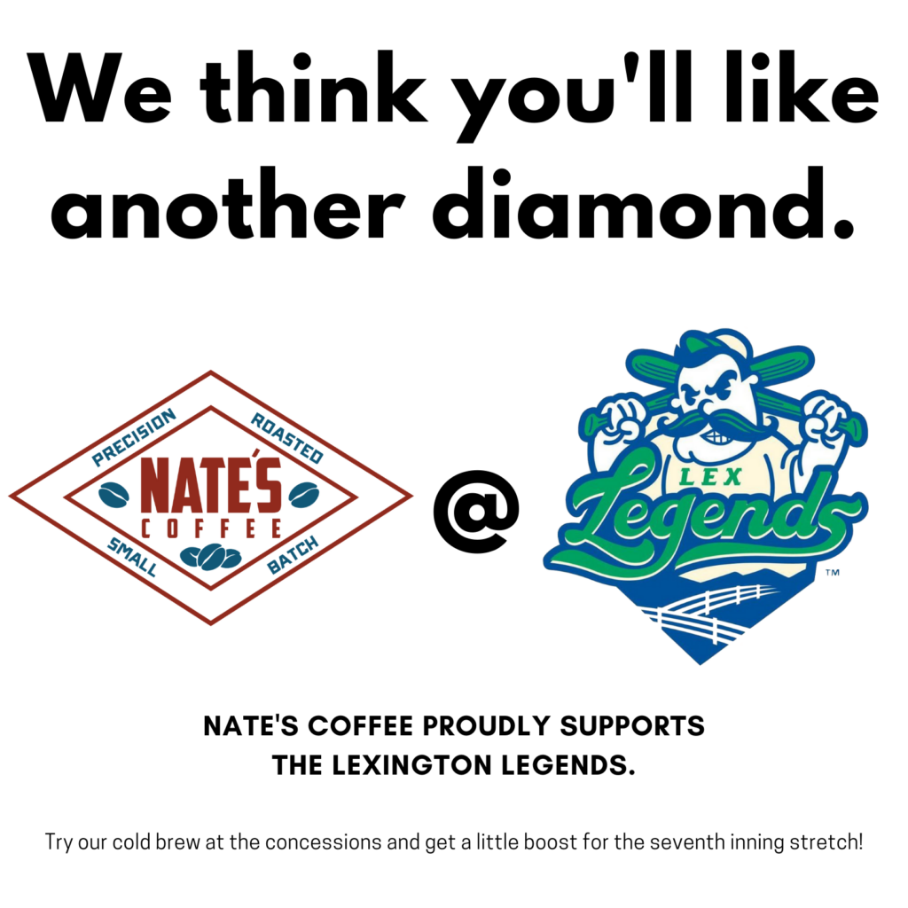 Nate’s Coffee’s owner, Nate Polly, will be throwing the ceremonial first pitch at the Lexington Legends baseball game on September 29th as part of their celebration of National Coffee Day. There will also be coffee giveaways and Nate’s Coffee coupons for those in attendance.